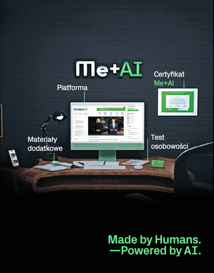 Zaczynasz uczestnicząc w certyfikowanym kursie Me+AI, którego celem jest wyrównanie poziomu wiedzy w społeczności i zbudowanie swojego osobistego systemu współpracy z AI. Po uzyskaniu certyfikatu rozpoczynasz personalizację swojej ścieżki rozwoju dobierając te rzeczy, których aktualnie potrzebujesz.